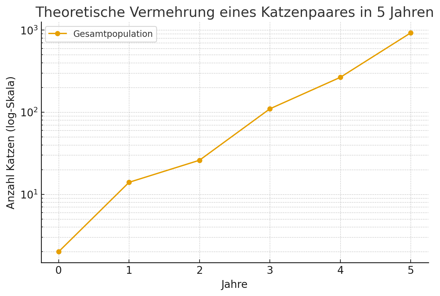 Nach Modellrechnungen (wenn man alle überleben lässt) kann ein einziges Katzenpaar in 5 Jahren über 20.000 Nachkommen hervorbringen. Manche Schätzungen gehen sogar von über 60.000 Katzen aus, je nachdem wie viele Generationen sich überlagern.